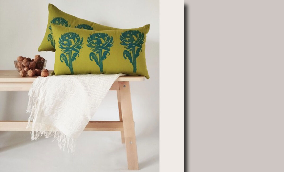 von Aggeliki aus Athen. Sie kreiert kleine Kunstwerke auf Leinen, die uns zum Lächeln bringen können, wenn wir uns der Inspiration ihrer Arbeit öffnen und sie als einen Dialog sehen mit der Stadt, in der sie lebt. Sie sagt: Athen hat eine gewisse Energie, eine Aufregung, ein ständiges Gefühl der Überraschung – freuen wir uns auf ein Stück Griechenland.